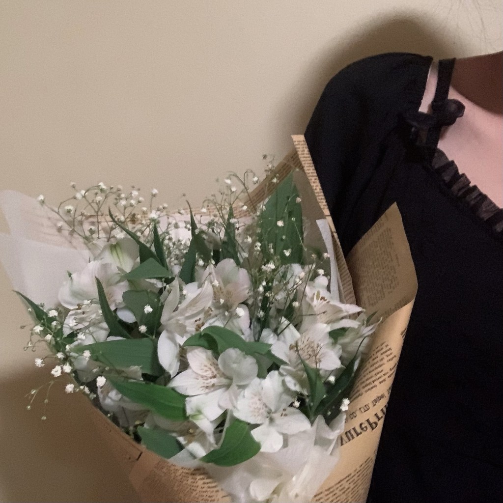 I spent $68 to stock flowers: $44 roses; $6 lily, $5 myosotis; $5 eucalyptus; $5 baby’s breath.