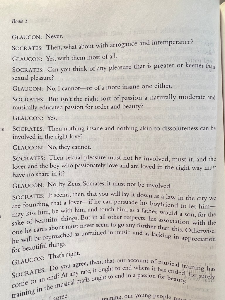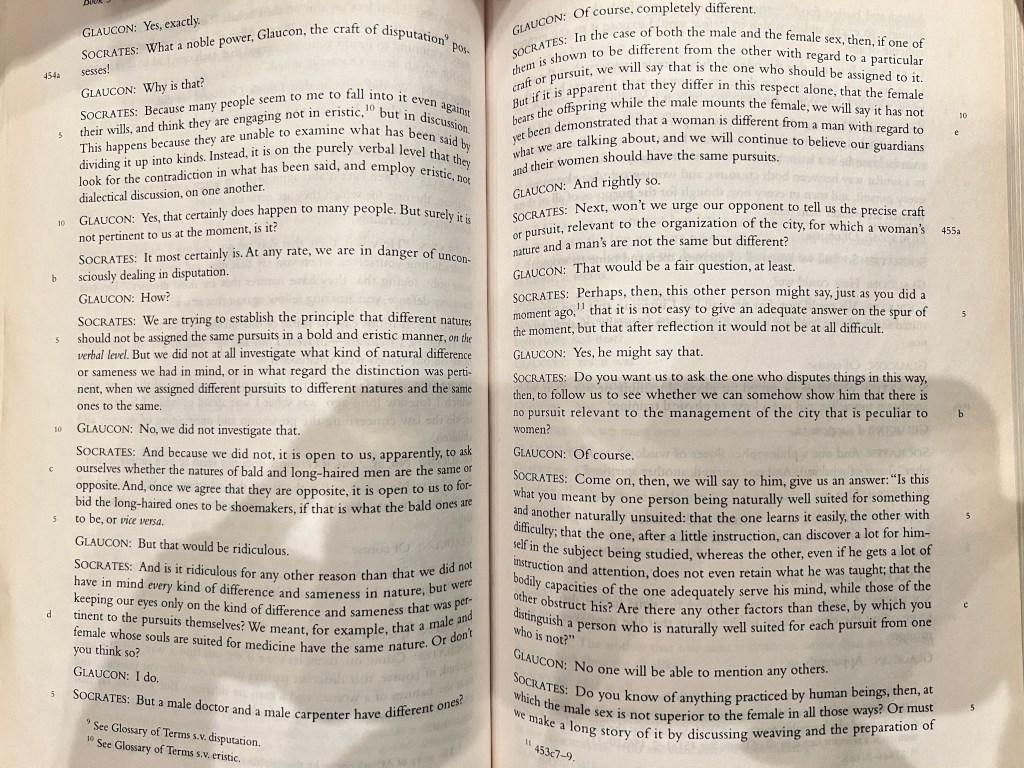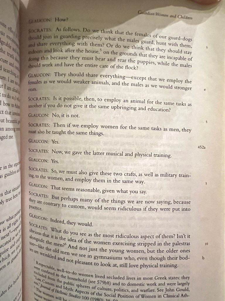 For example when they are discussing about if women have the same right and status as men, Socrates asked if women should do the same job guarding the cities as men, and he used the phrase “guard-dog”. It confused me for a while because I can’t decide whether in his opinion “guards” are unnecessary and in lower class of the society structure. In Chinese, “dog” as an adjective have very negative meaning.
